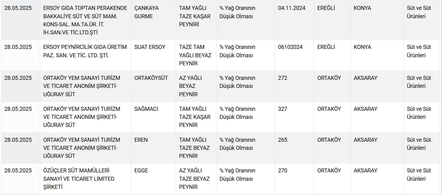 – الأجبان: لوحظ أن بعض أنواع الجبن القشقوان والجبن الأبيض تحتوي على نسبة دهون أقل من النسبة المعلنة، في علامات تجارية مثل “KILINÇ” و”PAYSÜT” و”YEŞİLÇAY” و”SÜTLÜCE” و”UFUKBEY”.